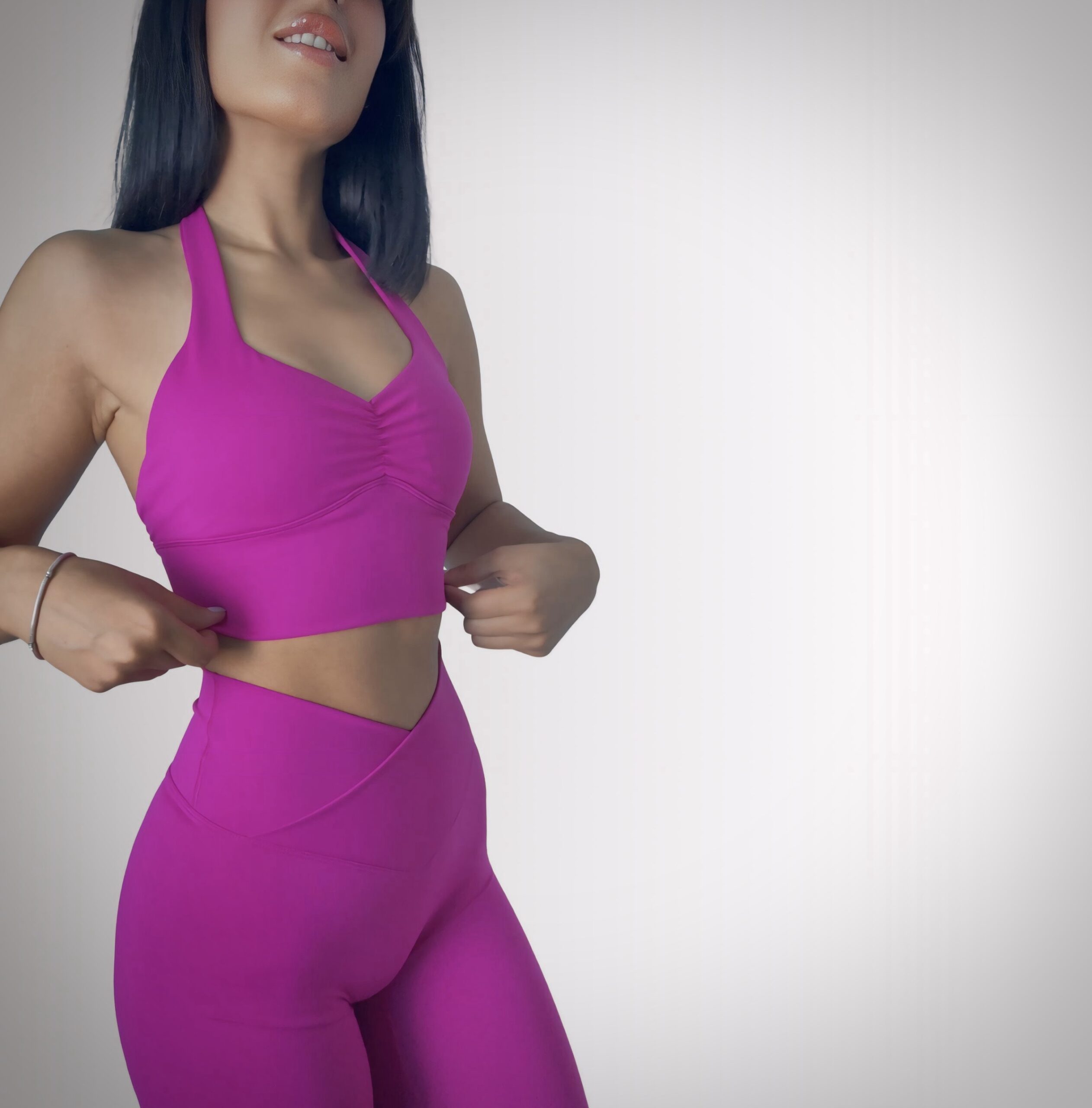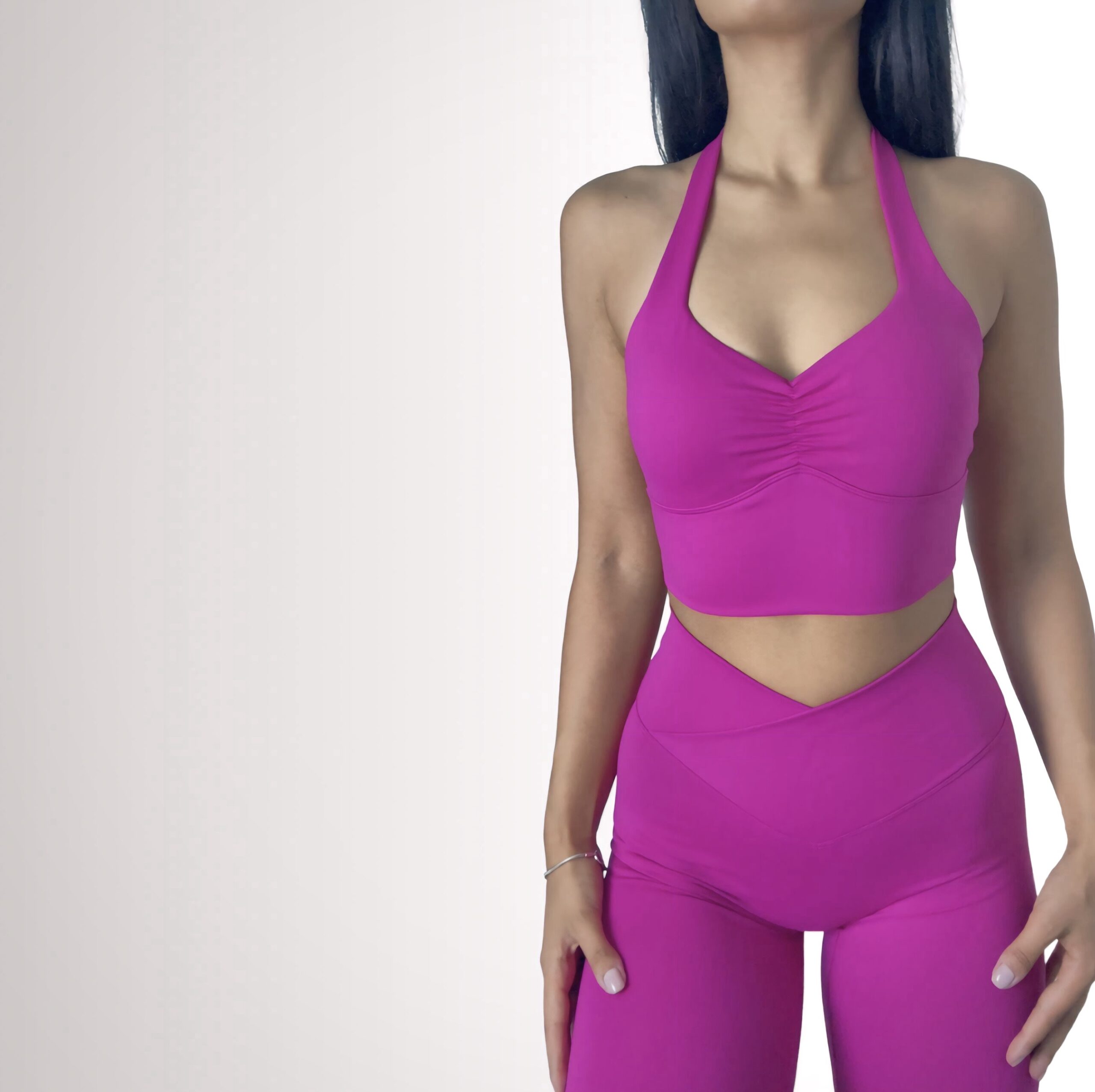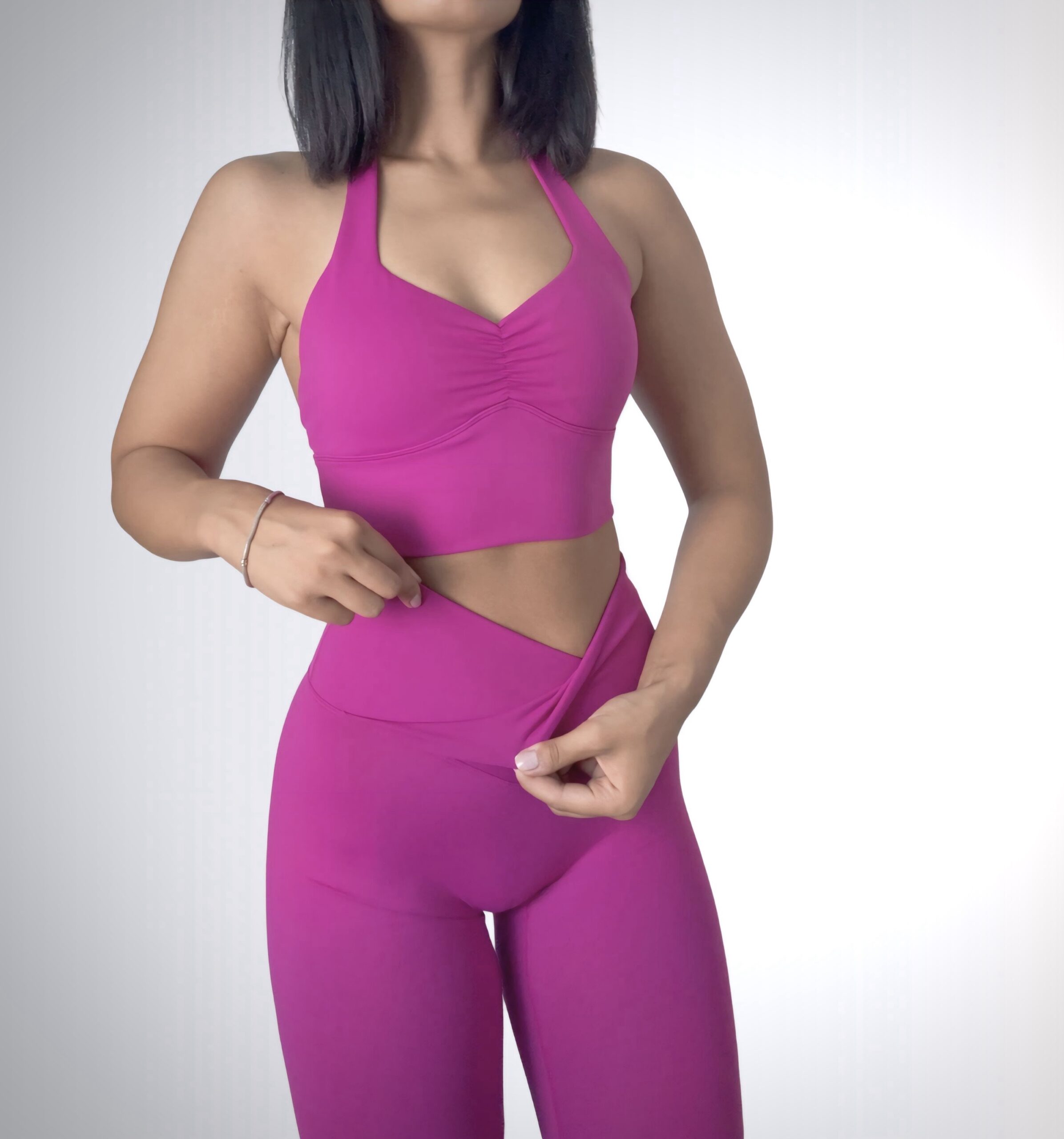 structured and fit to body, with the concept of V shaped front waistband. The V-cut design in our leggings enhances the natural curves of your waist by drawing the eye inward, creating a visually slimming effect. This strategic contouring accentuates the hourglass shape, sculpting a more defined and flattering silhouette.